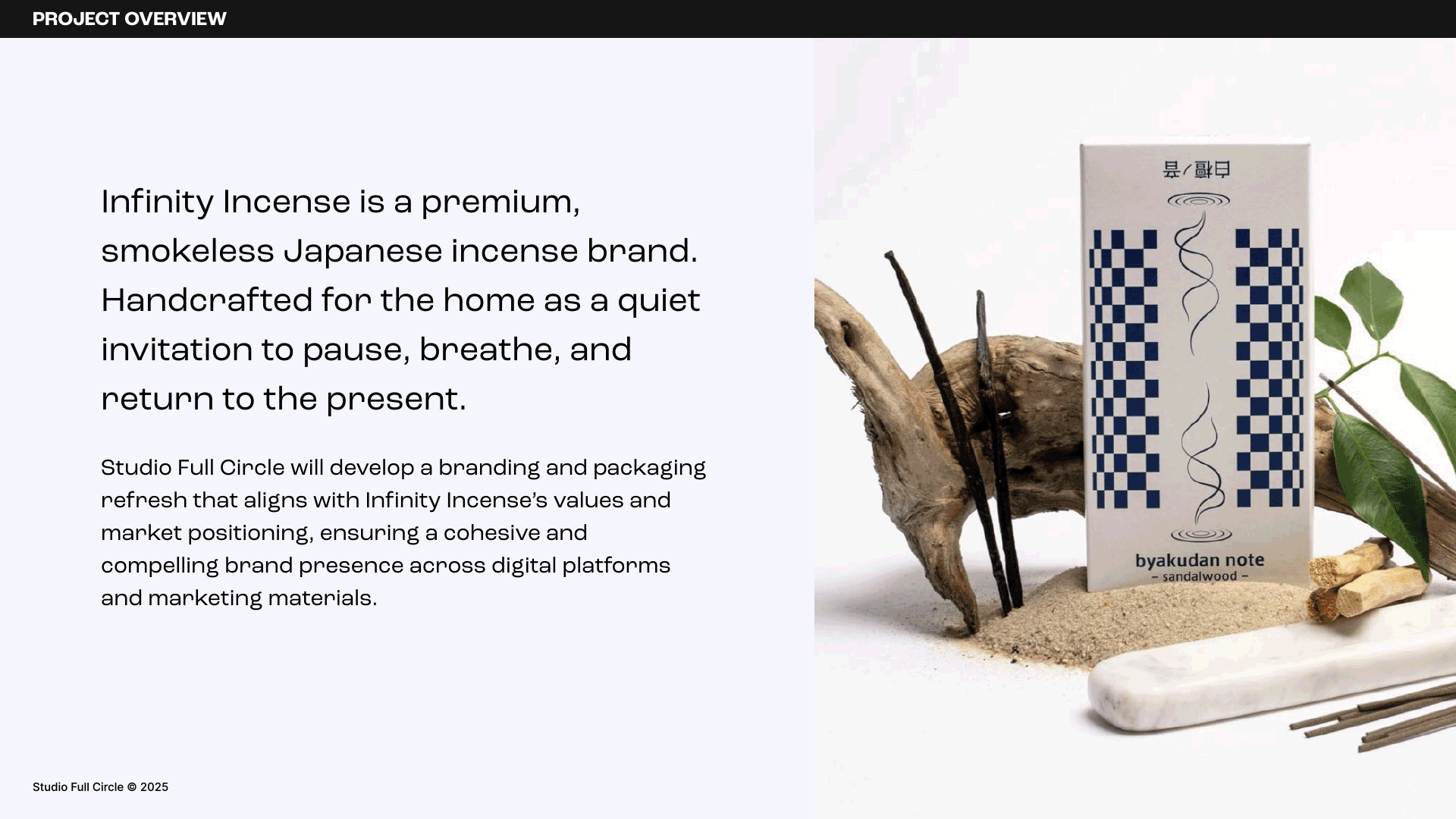 In an overstimulated world, the home is no longer just a shelter; it's a sanctuary. Infinity Incense creates premium, smokeless Japanese incense, but their existing branding didn't reflect the high quality of the product.